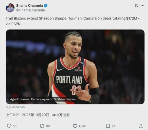 北京时间10月20日上午,据NBA名记Shams报道,开拓者连签两份大合同:4年9000万美元续约谢顿-夏普;4年8200万美元提前续约图马尼-卡马拉。这哥俩的合同加起来4年1.72亿美元,对开拓者来说绝对算是大手笔了。