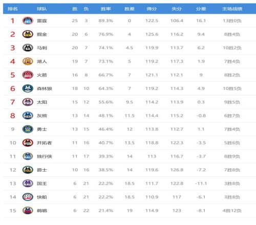 雷霆输球后25胜3负继续高居联盟第一。雷霆输球给掘金送上大礼,掘金目前20胜6负,落后雷霆4个胜场,虽然差距不小,但掘金目前6连胜,他们在缺少戈登、布劳恩的情况下仍能连续赢球,走势非常好。雷霆近3场比赛输了2场,这2场输球雷霆的主力俱在,看得出来雷霆的状态相比之前下滑不少,此消彼长,掘金有希望撼动雷霆西部第一的排名。