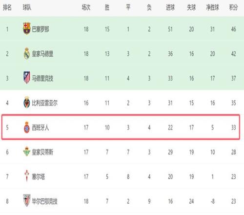 本场过后,西班牙人在西甲已经迎来5连胜,他们是除了巴萨之外,西甲近期状态最好的球队。截至目前,西班牙人继续排名第五,他们只落后第四的比利亚雷亚尔2分,和第三的马竞也只差4分。如果西班牙人继续保持状态,他们甚至有希望竞争前三。