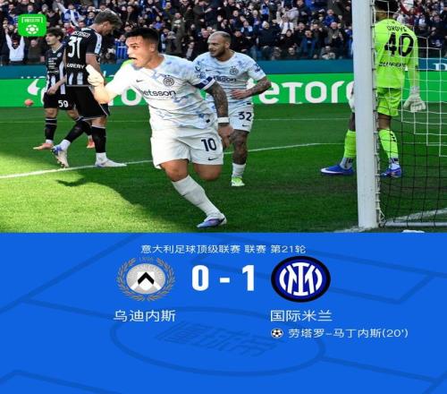 北京时间1月17日意大利足球顶级联赛 联赛 第21轮,乌迪内斯主场对阵国际米兰。上半场,埃斯波西托助攻劳塔罗-马丁内斯破门,率先打破场上平衡。下半场,埃斯波西托越位在先,迪马尔科的进球被吹无效。最终,乌迪内斯主场0-1不敌国际米兰。