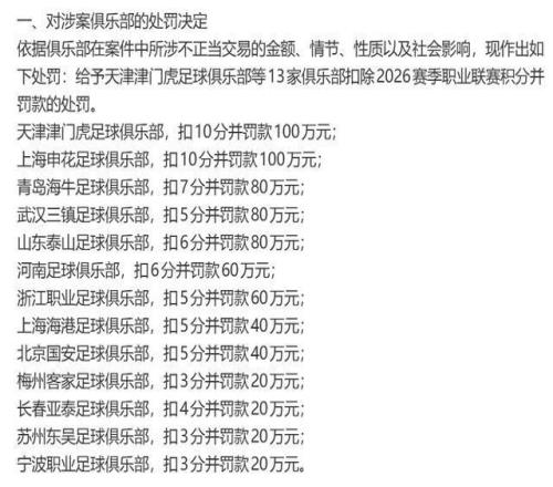 上海申花与天津津门虎因情节严重,被顶格扣除10分并罚款100万元;青岛海牛、山东泰山等俱乐部按涉事程度,分别面临7至3分的罚分及20万至80万元的罚款。