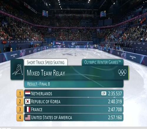 来到第五棒,主场作战的意大利队完成反超来到第一,而加拿大和比利时队也在此后先后超越中国队。最终意大利队彼得罗·西格尔第一个冲过终点,并且倒着越过终点线缔造又一幅“世界名画”,中国队以2分39秒601的成绩获得第四。