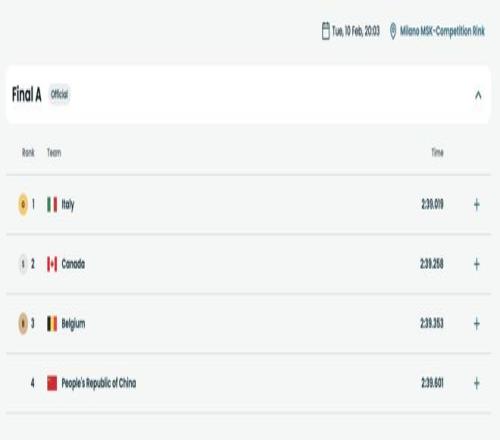 北京时间2月10日,2026年米兰冬奥会短道速滑项目开赛,男女混合团体接力项目产生首金。最终,东道主意大利队获得金牌,加拿大银牌,比利时铜牌,中国队获得第四名。